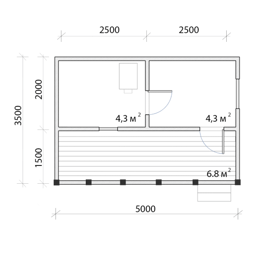 Чуть более дорогая, чем 2х4 м, но при этом одна из самых доступных каркасных бань среди наших проектов. Вытянутая форма позволяет разместить баню на небольшом участке, а увеличенная длина добавляет полезное пространство. Из раздевалки можно сделать полноценную комнату отдыха с небольшим диваном, столиком и всем необходимым для отдыха.